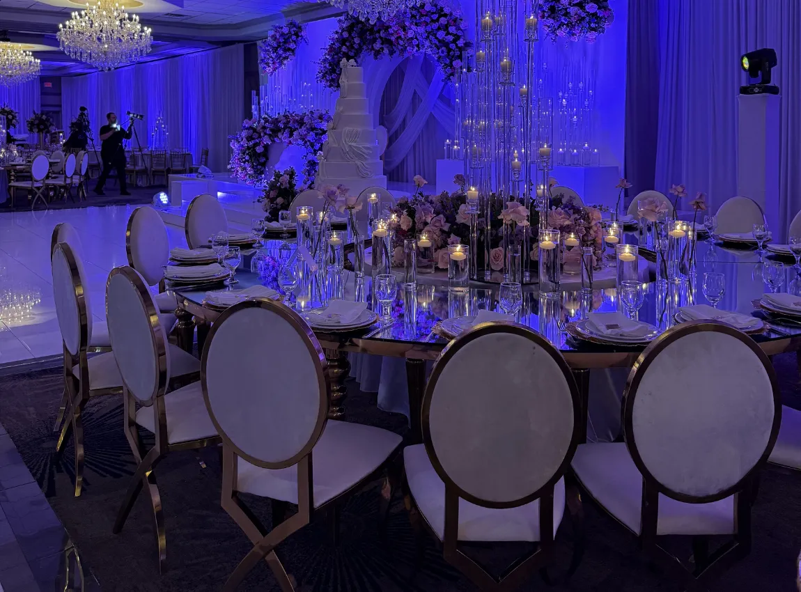A modern, light-catching option for wedding head table rentals in Detroit, Novi, and Dearborn—pairs beautifully with acrylic seating and luxury décor.